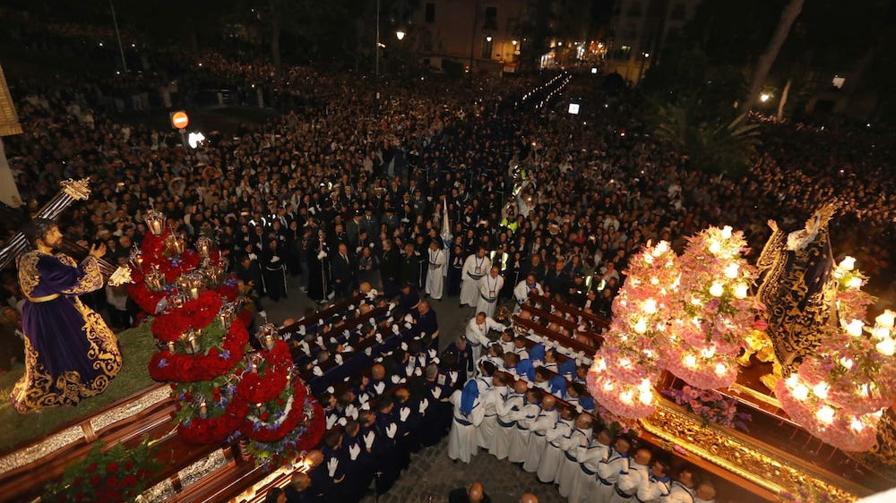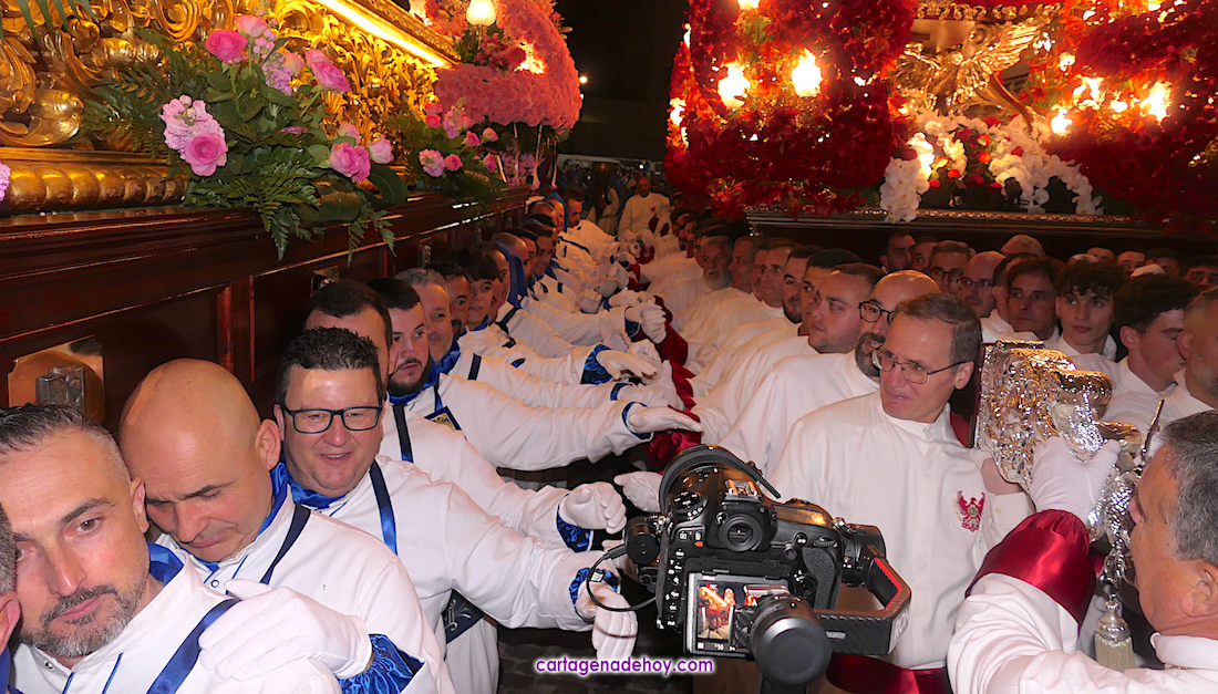 La Semana Santa de Cartagena vibra en la madrugada con el Encuentro. La plaza del Lago albergó a miles de cartageneros para ver juntos a los tronos de Jesús Nazareno y la Santísima Virgen Dolorosa. Esta noche, desde las 20 horas, se celebra el entierro marrajo.