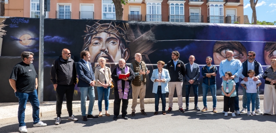 El mural creado por el artista Nauni 69 por encargo de la Junta Vecinal Municipal se ha inaugurado horas antes de que Jesús con el madero pase por delante en la procesión del Encuentro.
