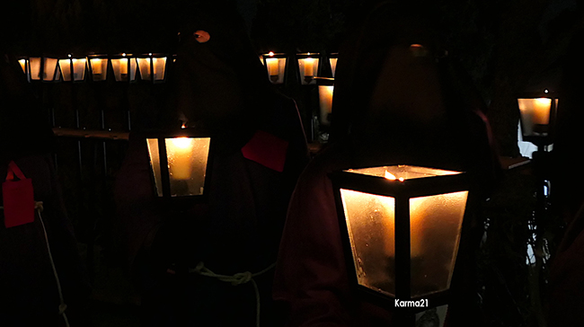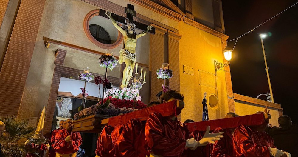 Imagen del trono de Cristo Crucificado corresponde a la procesión del Martes Santo, que culminó con el encuentro con la Soledad ante la iglesia de Santa Florentina. Esta noche tendrá lugar el segundo cortejo pasionario y, quizás, uno de los más singulares de España, pues en la medianoche se adentra en el cementerio para representar el entierro de Jesucristo.
