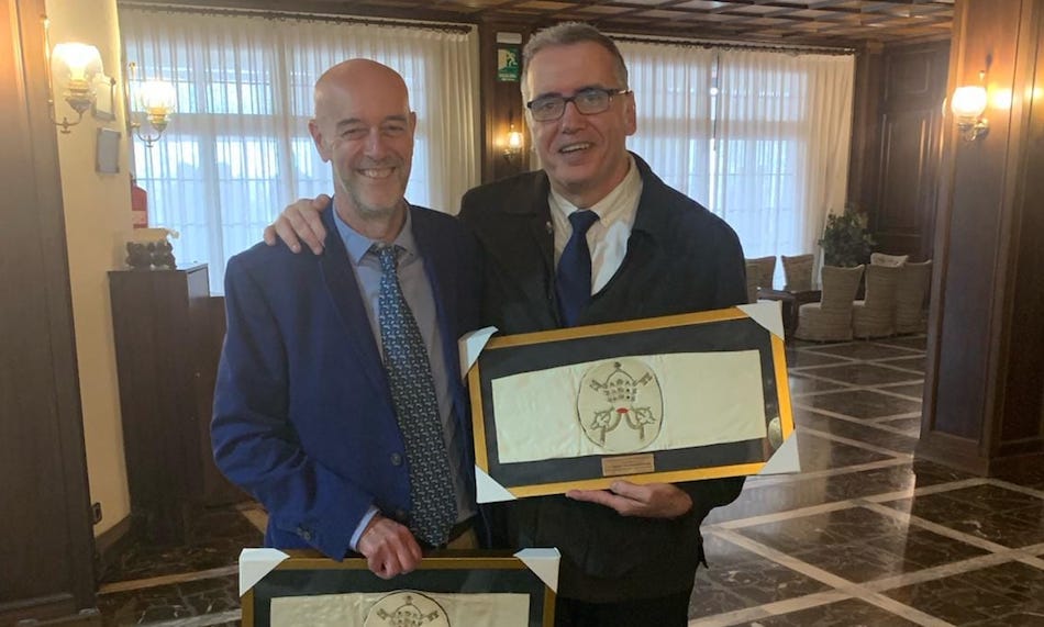 Pedro Pablo Hernández Hernández, vicepresidente de la Autoridad Portuaria, ha sido nombrado ‘Portapasos de honor’ de la Agrupación de San Juan Evangelista de la Cofradía California. En la imagen, recoge el nombramiento de manos del presidente sanjuanista, Francisco Manuel Pozo.