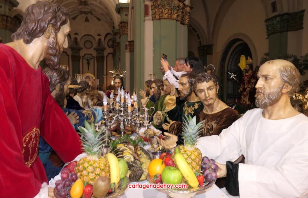 Los californios ponen en la calle esta noche su magna procesión, en una jornada que antes tiene como alicientes las visitas al montaje de tronos, la colocación de la corona de espinas, las indulgencias plenarias y la representación del 'Lavatorio de Pilatos'. También hay desfile pasionario en El Beal. En la foto, los comensales de la Santa Cena, que cumplen 75 años desde que llegaron las imágenes creadas por el escultor García Talens.