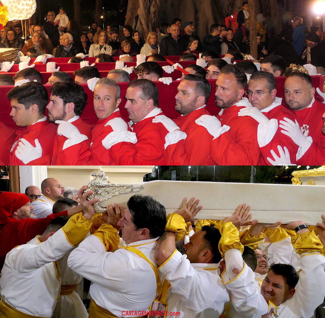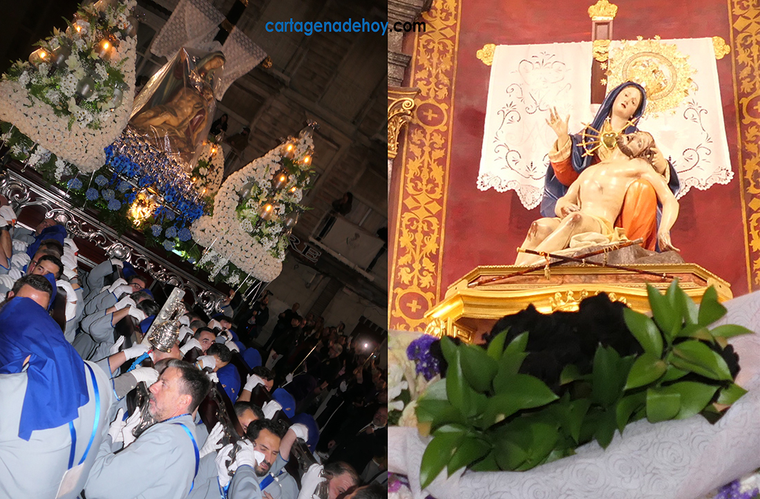 Numerosas personas, tras el paso de la Virgen de la Piedad por la Caridad, se quedaron en la basílica para fotografiarse con las singulares rosas negras, que, por lo que nos cuentan, son muy escasas en el mundo, siendo las que llegan a Cartagena cosechadas en Holanda. Al parecer, precisan de climas fríos para desarrollarse.