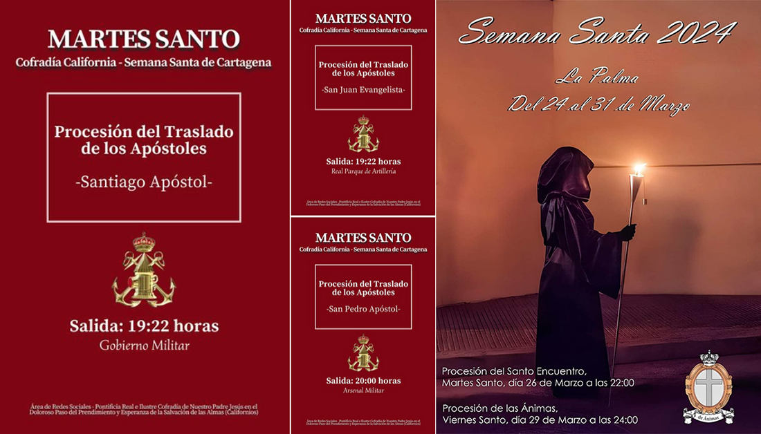 Los apóstoles adelantan sus salidas con respecto a años anteriores, pues serán a las 19.22 horas cuando comiencen las despedidas de los recintos militares por diferentes rutas, para después unirse y llegar juntos a Santa María. Por su parte, La Palma celebra la 'Procesión del encuentro' a partir de las diez de la noche.