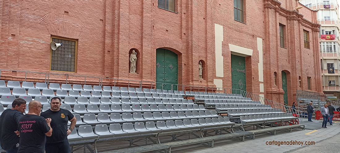 Una de las novedades de la Semana Santa de este año es la instalación de dos graderíos, con capacidad para unas cuatrocientas personas, junto a la puerta de la iglesia de Santa María, lugar por donde salen y se recogen casi todos los desfiles pasionarios de Cartagena.