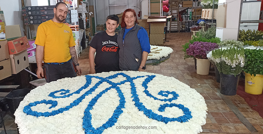 El personal de la floristería de San Francisco ha estado preparando los grandes escudos que lucirá la entrada de la basílica de la Virgen de la Caridad este Viernes de Dolores.