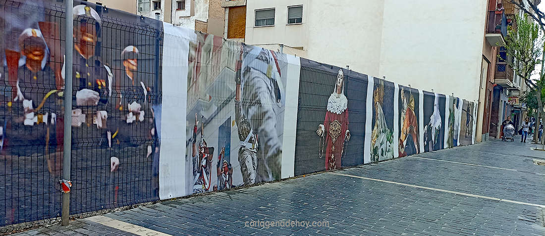 El casco histórico de Cartagena cada vez está más vestido para la llegada de su 'Semana grande', como muestra las imágenes de las procesiones que lucen en un lateral del solar de la calle de la Caridad con Duque.