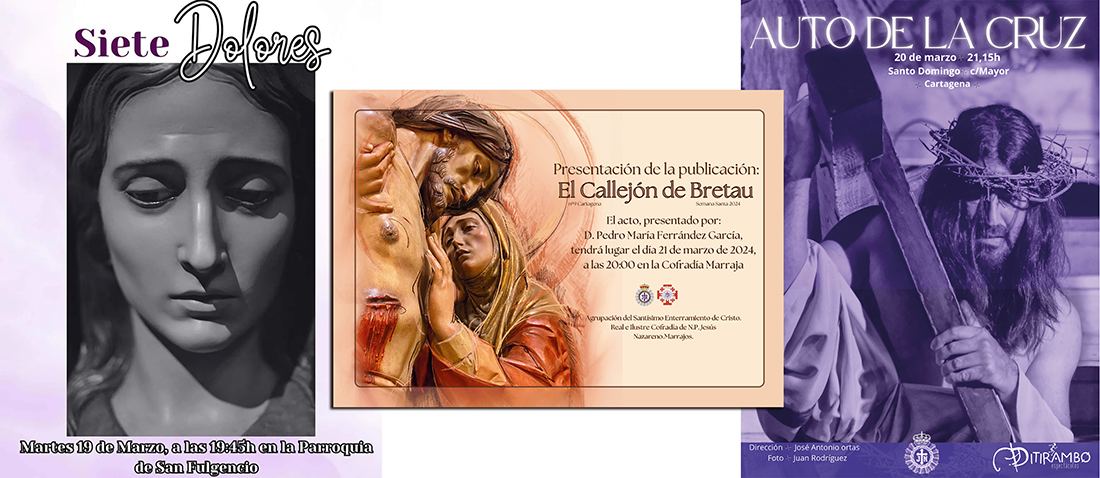La agrupación de la Virgen de la Soledad del Consuelo de la Cofradía del Cristo del Socorro celebra hoy, a las 19.15 horas, el acto de los 'Siete dolores' en la parroquia de San Fulgencio y el 'Ósculo' californio celebra su misa en Santa María (20.15 horas) con posterior entrega de distinciones. Para el miércoles destacan la presentación de la revista 'El callejón de Bretau' en la sede marraja y la representación del 'Auto de la cruz' en la parroquia de Santo Domingo. Además, la Catedral será el marco de 'Las cinco llagas'.