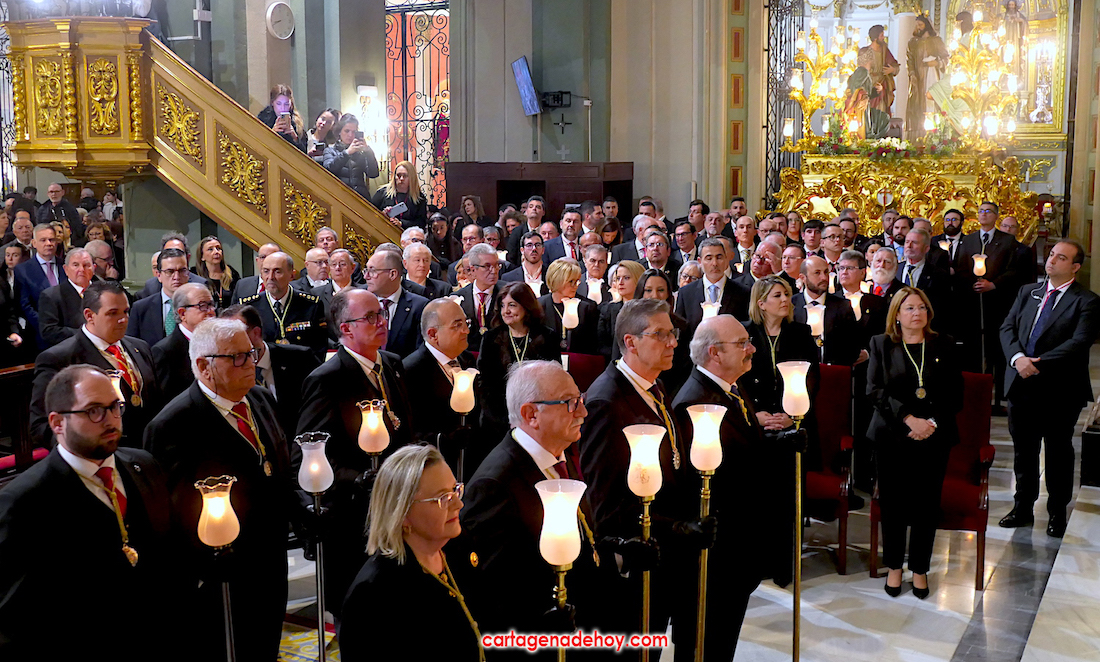 La iglesia de Santa María desbordó su aforo en la Salve Grande california, donde se ensalzó a la Virgen y donde, en las peticiones, se pidió por los pobres, por los que no tienen trabajo, por los que tienen problemas económicos, por la lluvia y, entre otros, por los gobernantes y los procesionistas. En la foto, abajo, los hermanos mayores. Al fondo, el nuevo grupo y trono santiaguista del 'Lavatorio de los pies', que fue bendecido.