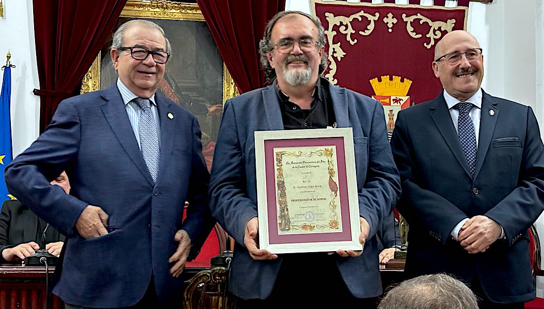 El colectivo ha nombrado al periodista ‘Procesionista de honor’ por su labor hacia la Semana Santa de Cartagena a través de diversos medios informativos, principalmente el diario digital Cartagena de Hoy. En la imagen, en presencia del presidente, Pedro Negroles, recibe el nombramiento de manos del ‘Procesionista del año 2024’, Manuel Martínez.