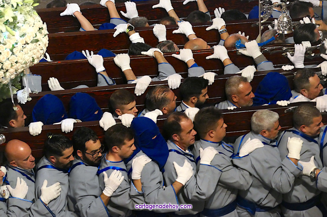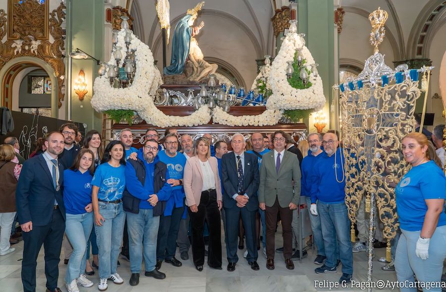 La tela bordada, que ha entregado Noelia Arroyo como madrina de honor, luce los escudos de Cartagena, de la Cofradía Marraja, de la agrupación de la 'Caridad Chica' y la de sus portapasos promesas.