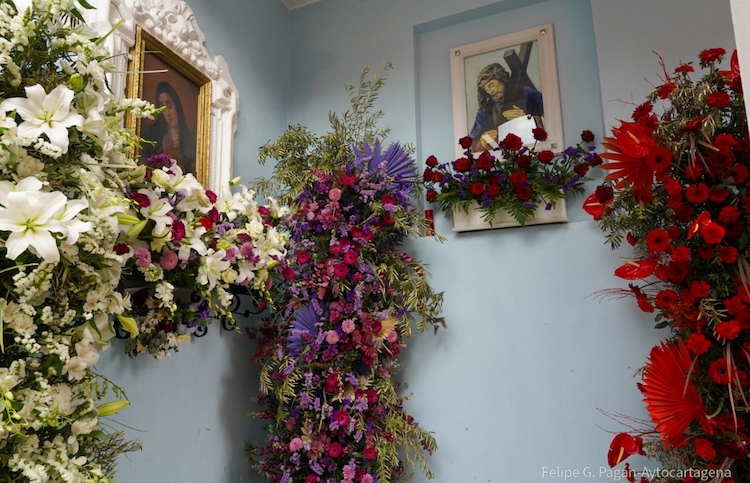 La emblemática esquina del casco histórico de Cartagena donde están las réplicas de los cuadros de la Soledad y del Nazareno luce con una ornamentación especial de flor natural con los colores de las principales cofradías procesionistas de la ciudad, en disposición de columnas, con motivo de la Semana Santa.