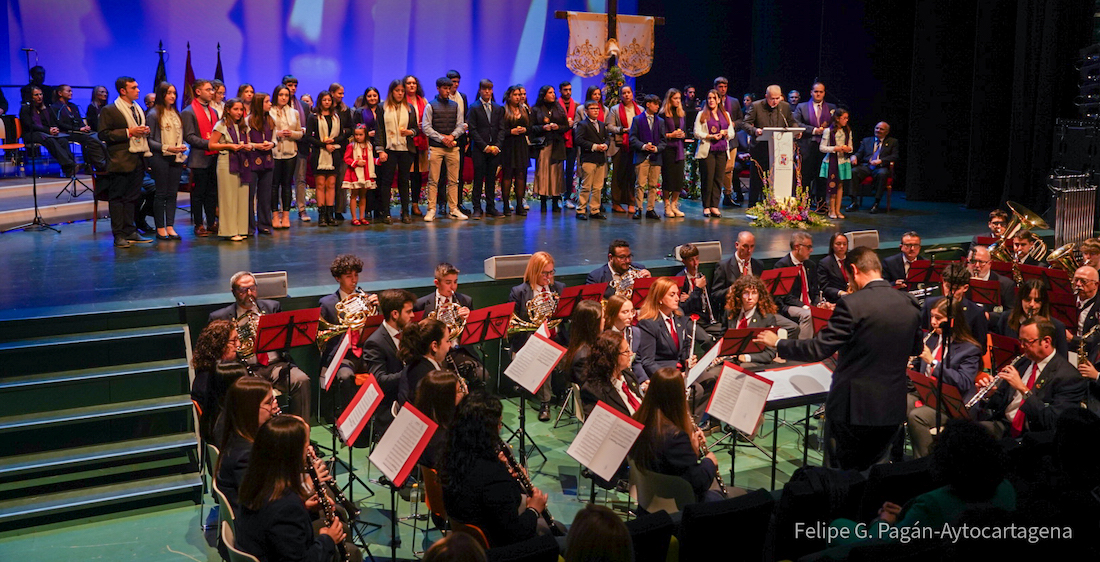 Fernando Gutiérrez Reche ofrece una oratoria jalonada por coro y orquesta en el que, además de ensalzar las procesiones, invita a a los cofrades “a ser pregoneros todo el año”, remarcando. “Toda nuestra vida es una procesión al encuentro de Cristo”. También demanda una mayor rendimiento procesionista a las redes sociales y una mayor promoción exterior, concluyendo de forma épica con música envolviendo sus palabras, el escenario plagado de jóvenes con velas y el público puesto en pie.