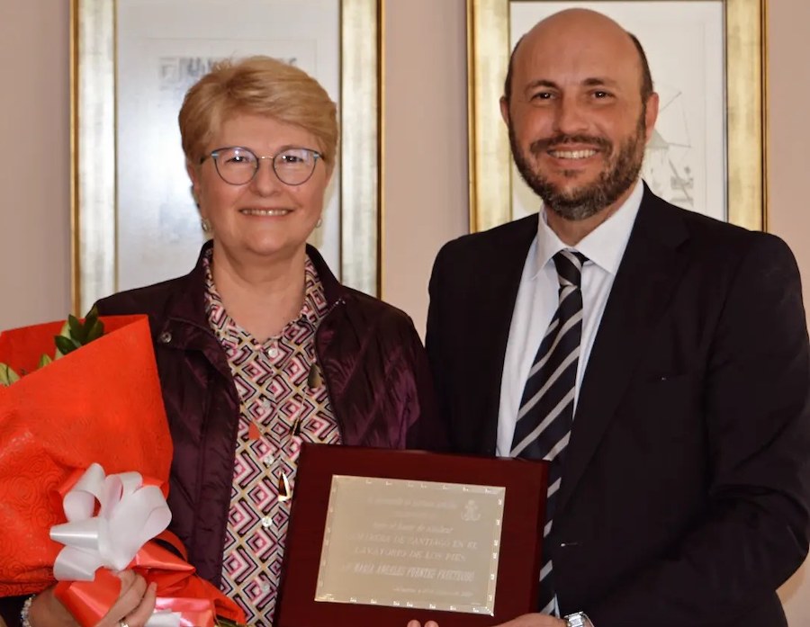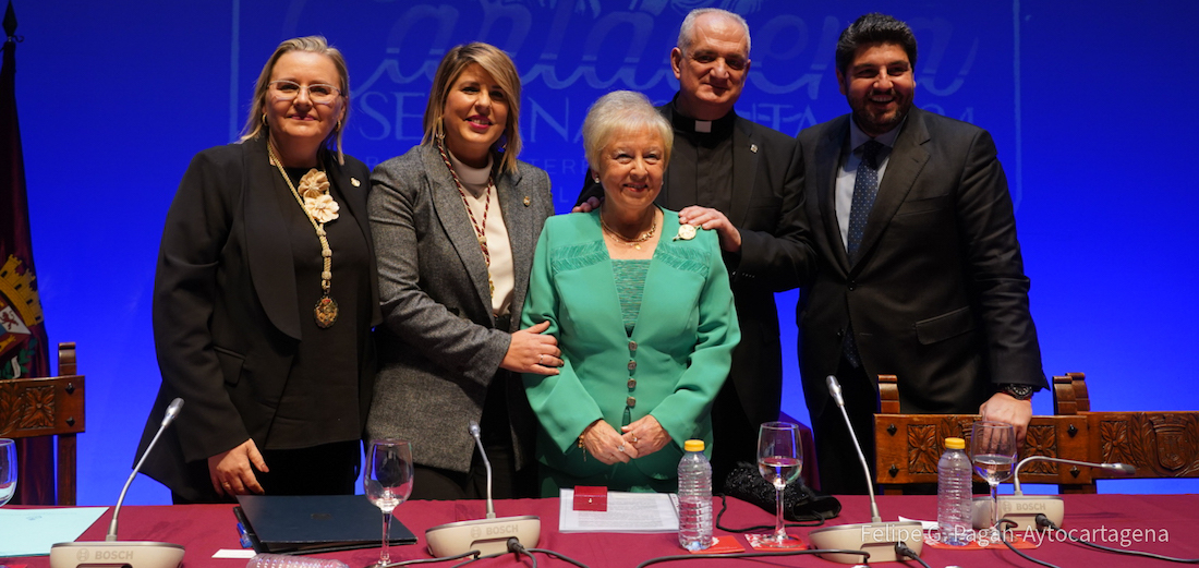 Maribel Zamora, quien ha relatado cómo se incoporó de lleno al mundo procesionista de Cartagena tras conocer a quien se sería su esposo (Antonio Visiedo), ha recibido el tradicional broche de oro y una placa como 'Nazarena mayor de 2023'.
