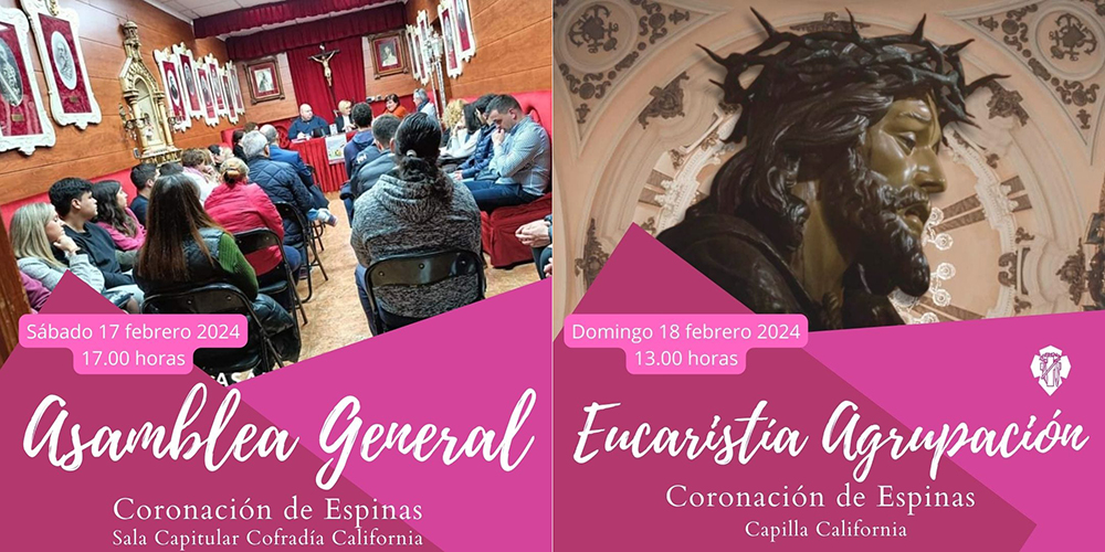 La agrupación california de la Coronación de Espinas inicia sus actividades previas a la Semana Santa este próximo sábado, a las 17 horas, con la asamblea general de hermanos en la sede encarnada de la calle del Aire. Al día siguiente, a las 13 horas, comenzará la tradicional eucaristía a su imagen titular en la capilla de la Cofradía California.