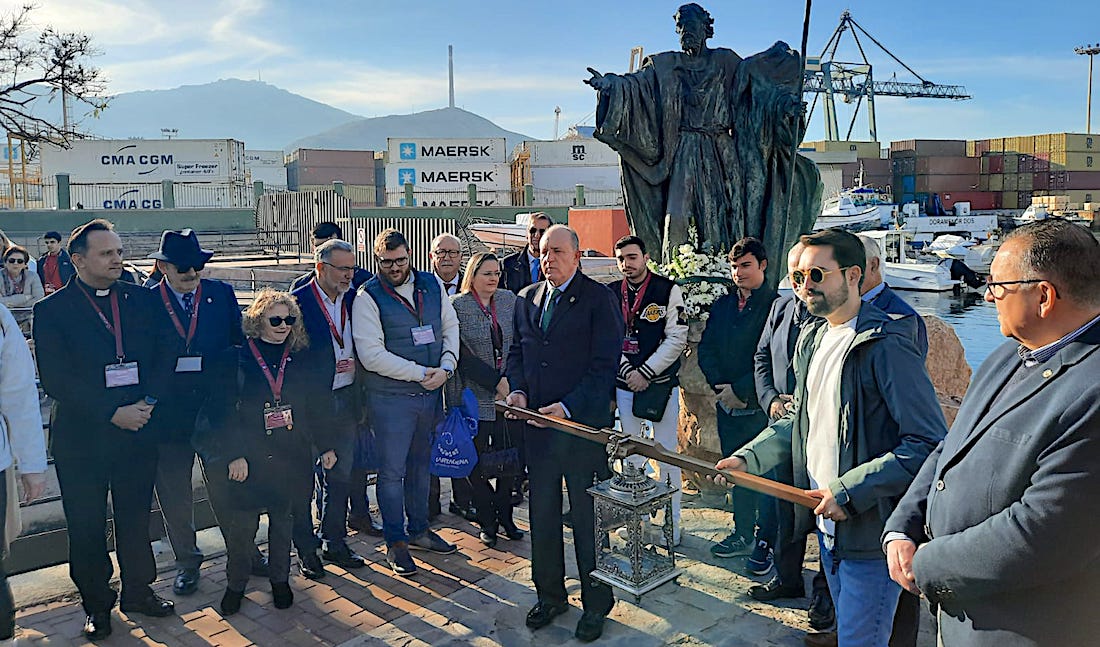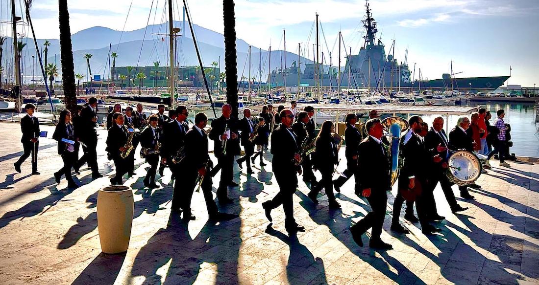 La agrupación musical 'Cartagena 1990' ha sido la banda encargada de poner la música en la llegada a la dársena del puerto de Santa Lucía de la 'luz' del 'XIII Encuentro diocesano de jóvenes cofrades', además de sus posterior traslado a la plaza del Ayuntamiento.