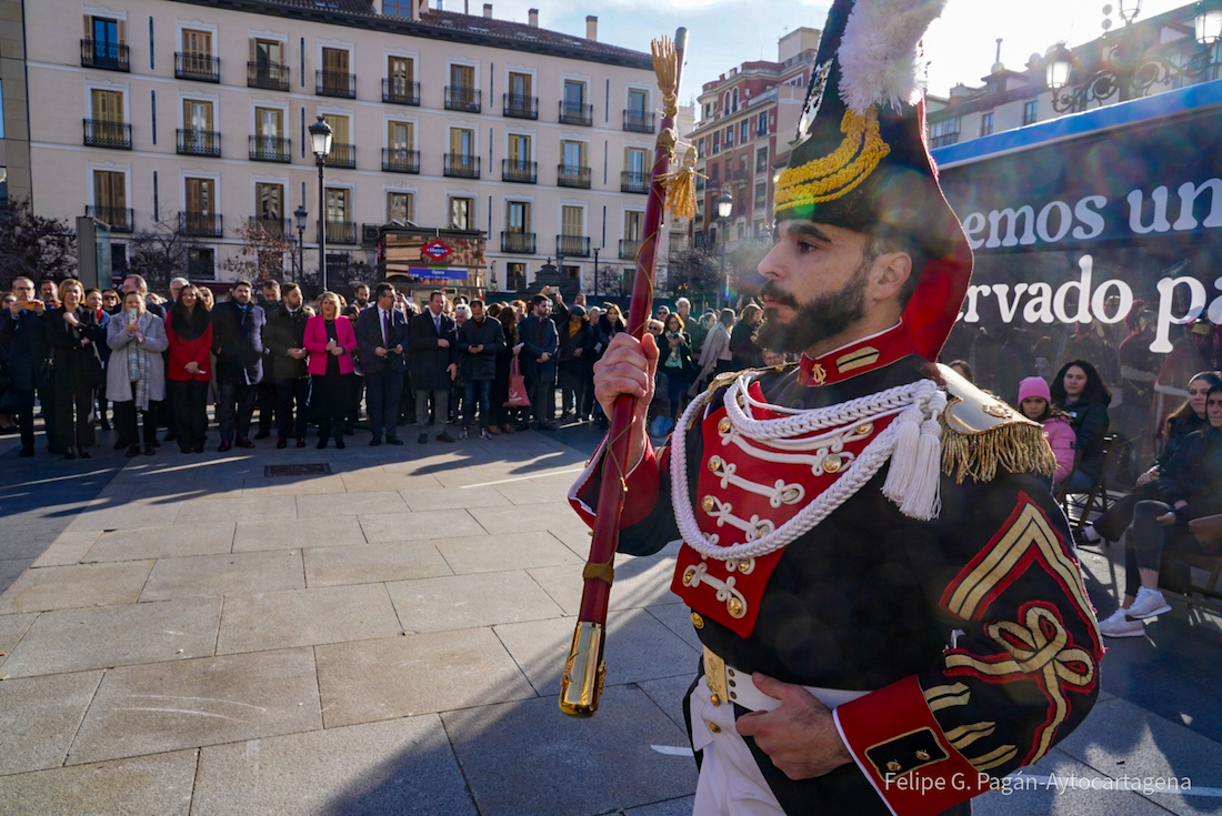 La plaza de Isabel II de Madrid, con motivo de la celebración de FITUR, ha acogido una exhibición cofrade que ha mostrado la marcialidad de los cortejos pasionaarios de Cartagena (representada por 8 granaderos marrajos y californios), la belleza de las obras que se convierten en museos vivientes en Cieza o Jumilla, o el espectáculo, la pasión y los bordados de Lorca, que también ha desplazado dos bigas romanas, además de los Tambores de Mula.