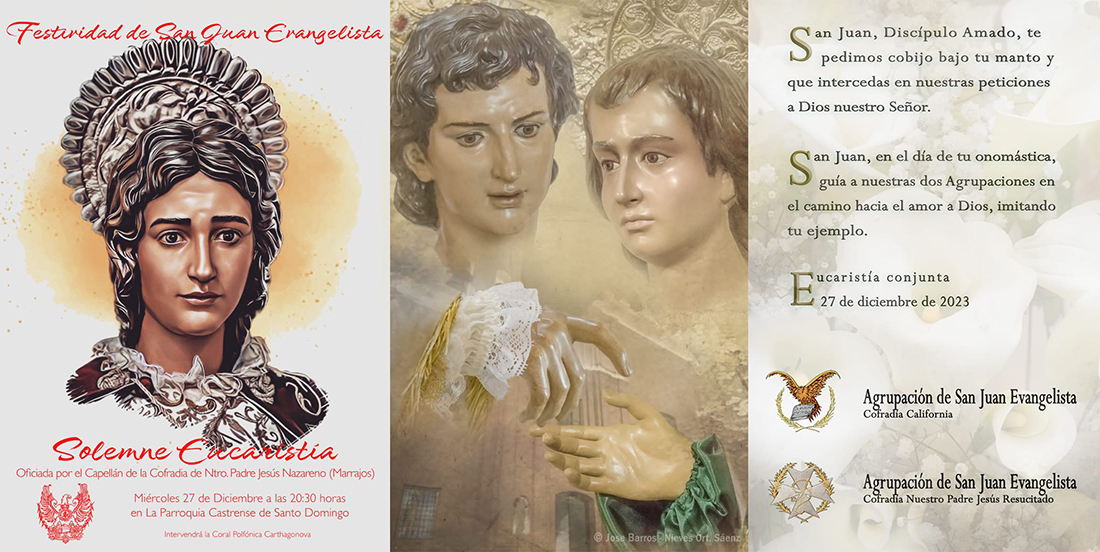 Las agrupaciones que llevan el nombre del 'Discípulo amado' de las cofradías pasionarias de Jesús Nazareno, Cristo del Prendimiento y Jesús Resucitado celebran hoy la festividad de San Juan Evangelista y apóstol con misas, que se celebrarán en Santo Domingo y en Santa María de Cartagena.