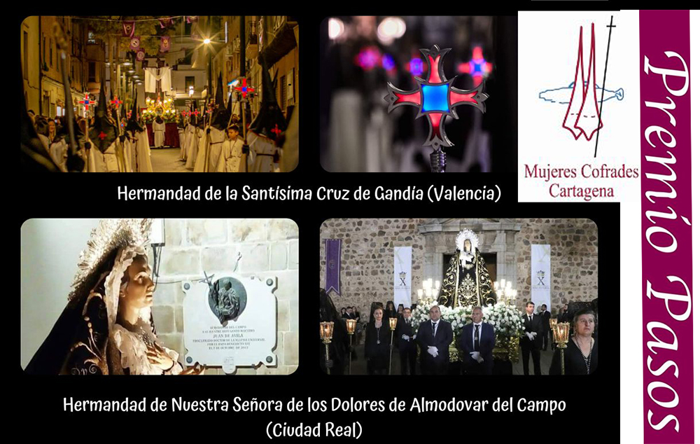 La Hermandad de la Santísima Cruz de Gandía (Valencia) y la Hermandad de Nuestra Señora de los Dolores de Almodóvar del Campo (Ciudad Real) aspiran al galardón que cada año entre la Asociación de Mujeres Cofrades de Cartagena para reconocer a aquellas entidades procesionistas que se esfuerzan en que exista una plena igualdad entre hombres y mujeres en la Semana Santa. Hoy resolverá el jurado.