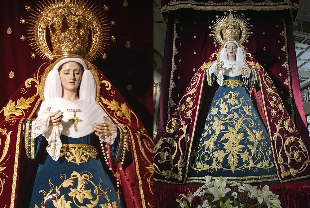La imagen de María Santísima del Rosario en sus Misterios Dolorosos de la Cofradía California presidió en la iglesia de Santa María la eucaristía solemne en su honor, en la que estrenó manto, túnica, rosario, fajín y tocado de tul.