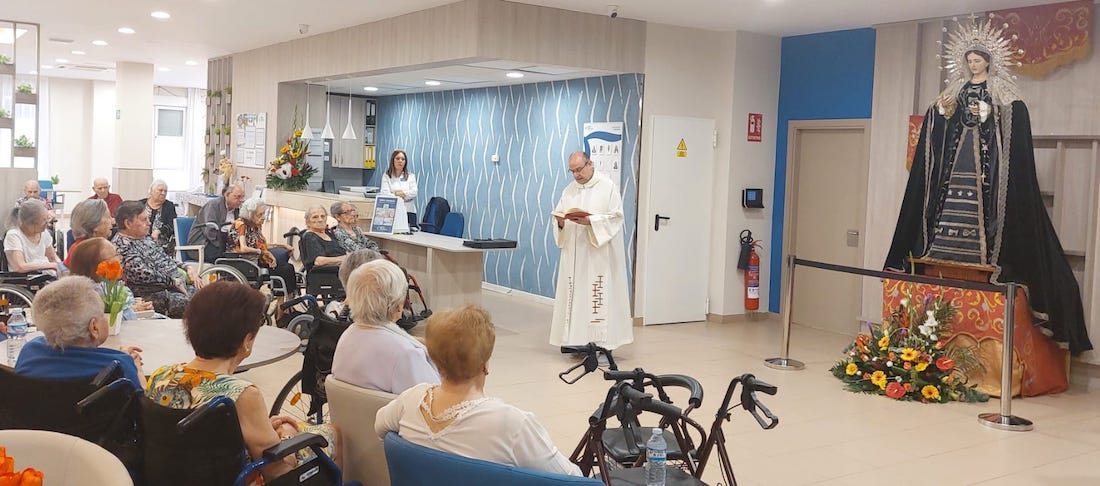 La imagen de María Santísima está desde ayer en la residencia y centro de día Orpea, en la primera ocasión que el 'Rosario de las antorchas' partirá desde un lugar distinto a la iglesia de Santa María, que sí será el punto de destino. Será esta tarde a partir de las siete y media.
