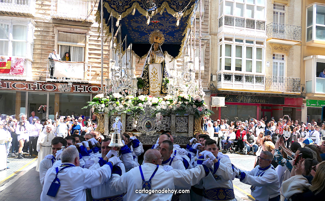 La agrupación de la Virgen ha hecho un alto muy especial en su recorrido ante la basílica menor de la patrona de Cartagena (foto superior con el trono en el pórtico del templo), donde todos los presentes han cantado la salve y se ha efectuado una ofrenda floral. La procesión transmitió la alegría de la resurrección de Jesús en una soleada jornada con muchos alicientes. GALERÍA DE FOTOS (pinchar aquí)