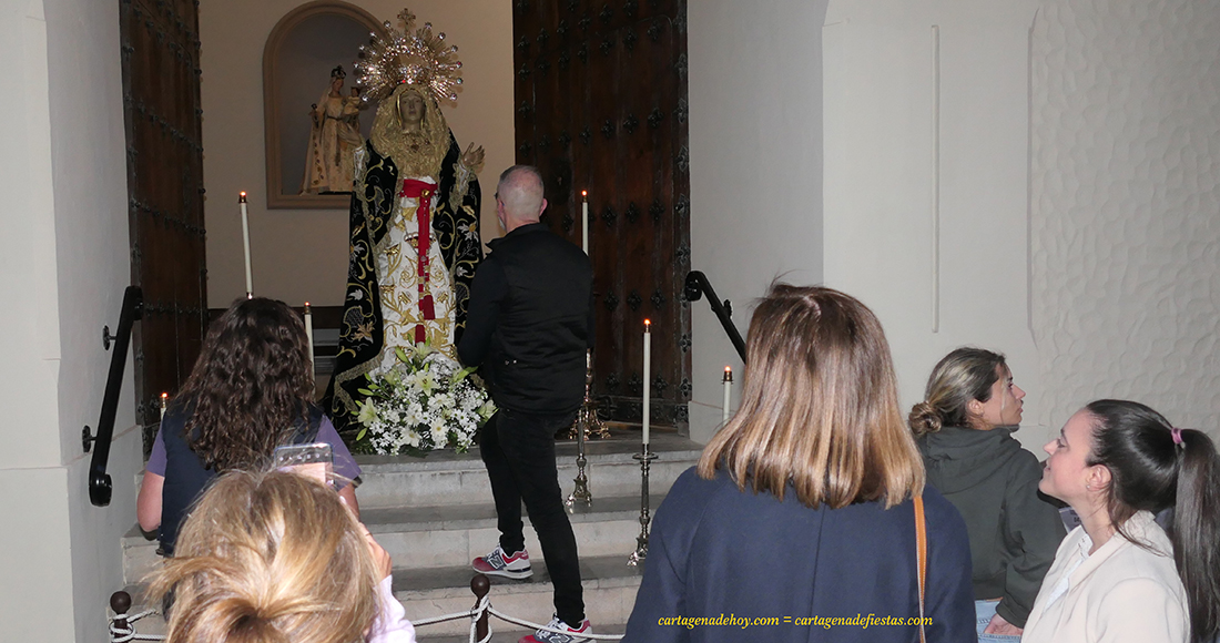 La Virgen de la Soledad, ‘madre de los marrajos’, fue ubicada anoche bajo el marco de la puerta exterior de la capilla de la Cofradía de Jesús Nazareno para ‘contemplar’ el paso de su hermandad en procesión.