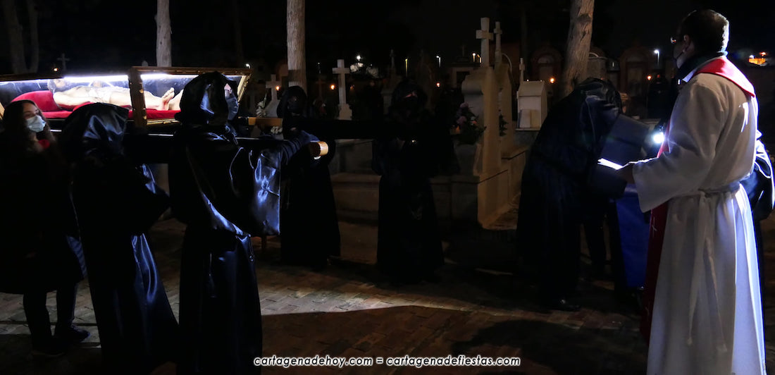 El Cristo crucificado y la Dolorosa volverán a salir este Martes Santo a las 22 horas desde la iglesia de Santa Florentina y la 'Procesión de las ánimas' del Viernes Santo, que se adentra en el cementerio, saldrá de la parroquia en la medianoche. En la foto, una escena del pasado año con el Yacente frente al sacerdote Pedro García Casas.