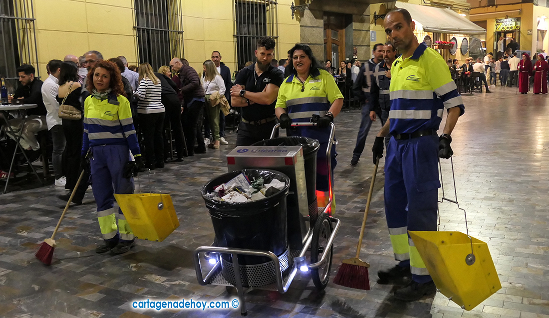 De forma paralela a la celebración de procesiones, hay varios gremios para los que es tiempo de trabajo. Un ejemplo está en las fotografías de este artículo con trabajadores de Lhicarsa, que están siendo muy visibles estas jornadas debido a su presencia constante para que el casco antiguo no acumule basura ante la presencia de tantas miles de personas.