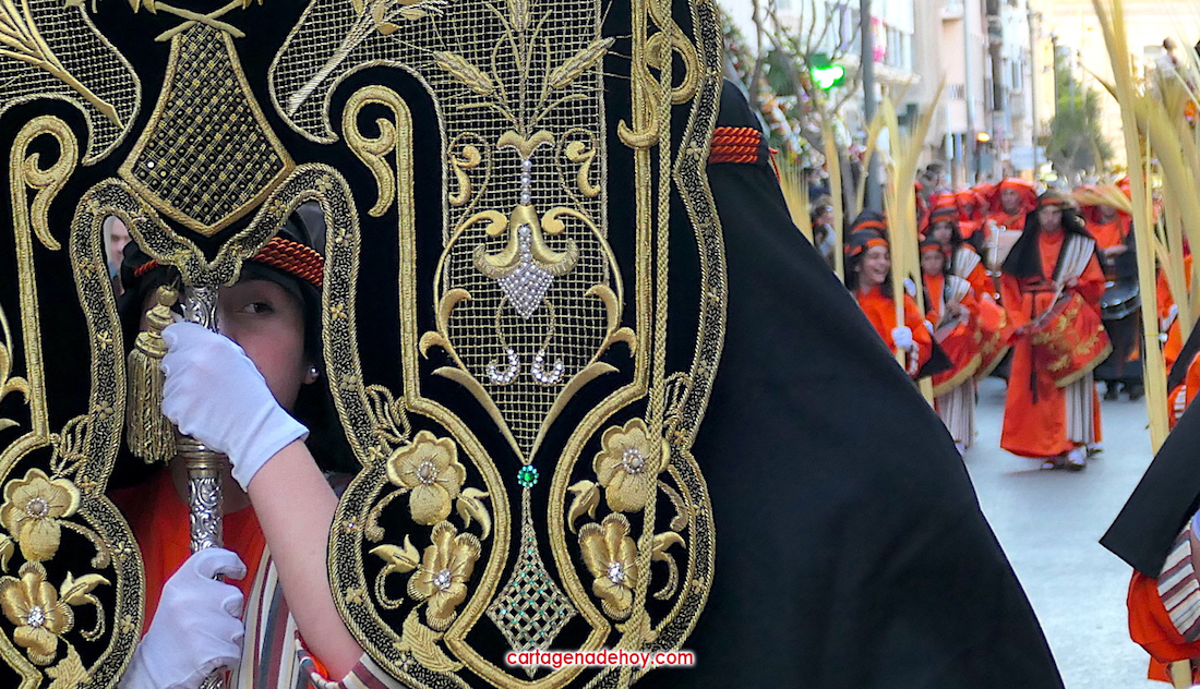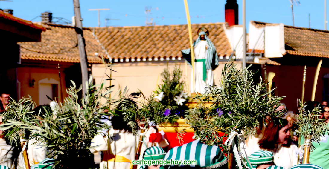 El pueblo cartagenero ha celebrado la procesión del Domingo de Ramos con una procesión formada por sesenta y cuatro jóvenes, en la que el trono que representa la entrada de Jesús en Jerusalén ha sido llevado a hombros.