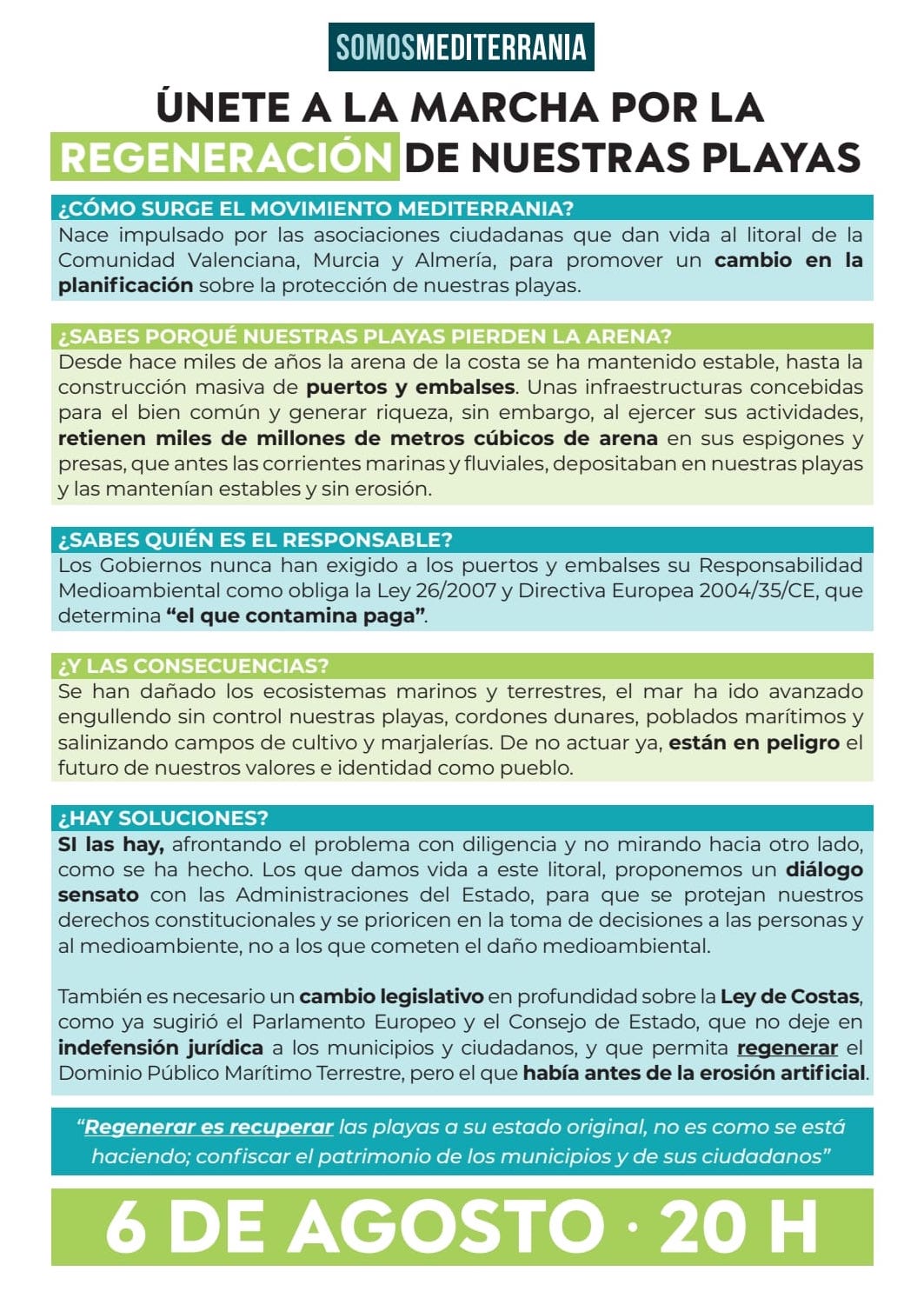 Asociaciones ciudadanas del litoral que abarca la Comunidad Valencia, Región de Murcia y Almería tratan de promover un cambio en la planificación de la protección a las playas y para este sábado, a las 20 horas, convocan marchas en diferentes puntos, entre los que figuran Los Nietos y Cabo de Palos.