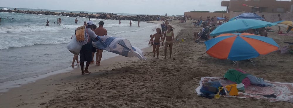 El hombre que va vendiendo vestidos y mantas por la playa, ofreciéndolos a los bañistas, es una imagen que se da desde hace (muchas) décadas y que no podÃa faltar este año, como refleja esta fotografÃa tomada en el ‘Mar Mayor’ de La Manga.