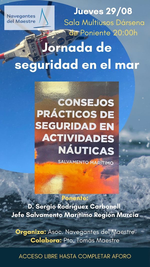 La Asociación de Navegantes del Maestre está formada por más de cien usuarios de barcos de vela con puerto base en el Puerto Tomás Maestre, siendo la modalidad deportiva del colectivo la navegación a vela, "que es una práctica ecológica y sostenible que desarrollamos cada fin de semana", indica su presidente. "Pensando en todos practicantes de la vela y en aquellas personas que tienen pasión por el mar en sus múltiples disciplinas, hemos organizado una Jornada Formativa gratuita con la colaboración de Salvamento Marítimo Región de Murcia para el próximo jueves en la sala multiusos del Puerto Tomás Maestre".