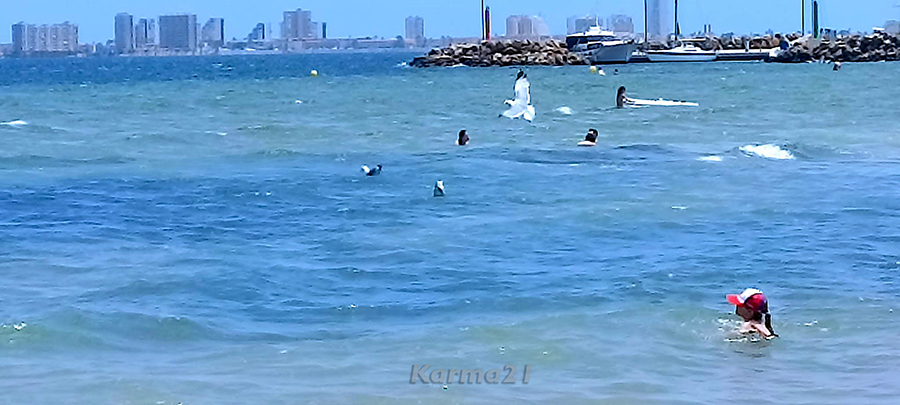 Bañistas y gaviotas comparten la playa de Islas Menores