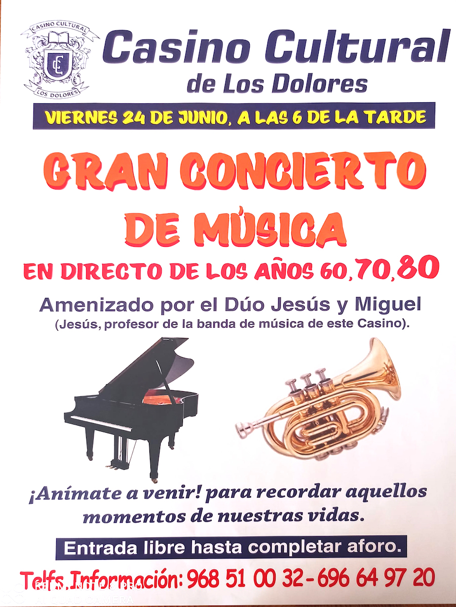 El Casino Cultural acogerá el día 24, a las 18 horas, la actuación del dúo Jesús y Miguel, que interpretarán en directo temas de los años sesenta, setenta y ochenta del pasado siglo. Entrada libre hasta completar aforo.