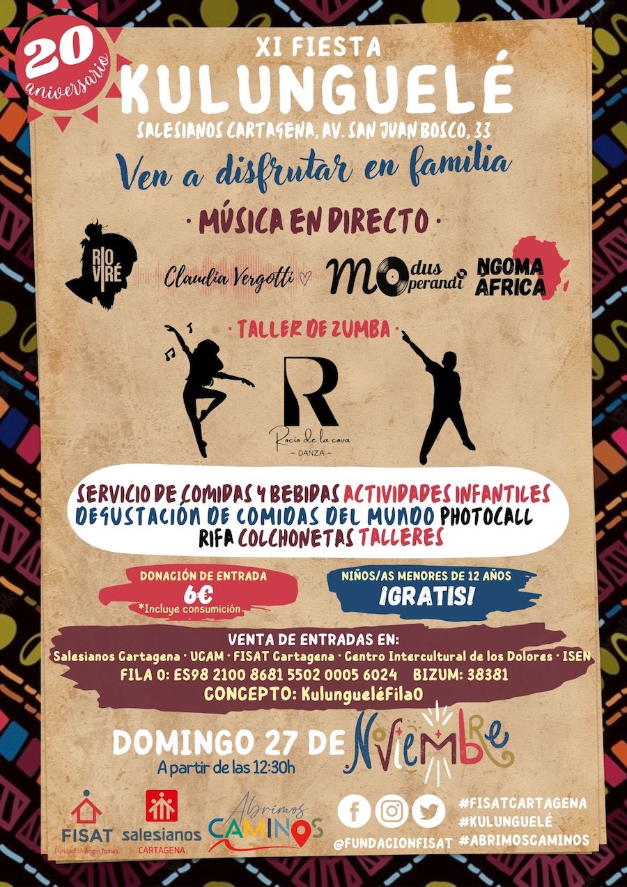 La fiesta Kulunguelé llega a su edición número 11 con la novedad de su celebración en horario de mañana, a partir de las 12:00 en el jardín del centro social del Colegio Salesianos Cartagena.