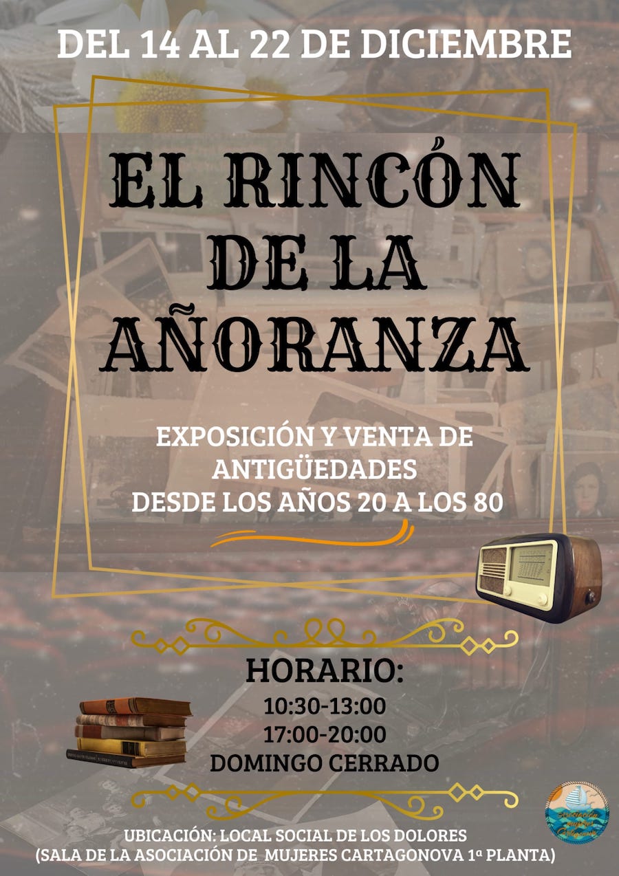 Objetos de los años 20 a los 80 del pasado siglo serán expuestos (con opción a compra) del 14 al 22 de este mes en la sala de la Asociación de Mujeres Cartagonova, en la primera planta del local social de Los Dolores, en horario de 10.30 a 13 y de 17 a 20 horas, de lunes a sábado.