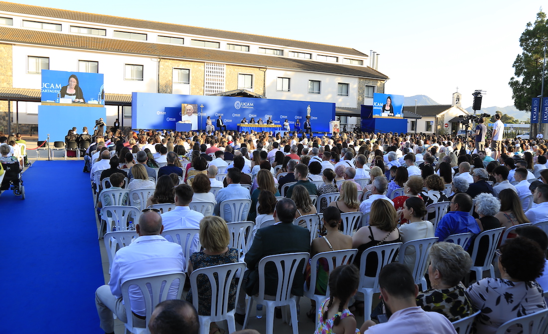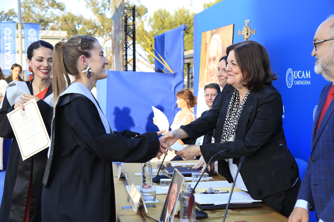 La celebración ha estado presidida por María Dolores García, presidenta de la UCAM, acompañada por José Jesús Guillén Pérez, presidente de la Agrupación de Portapasos de la Virgen de la Piedad, padrino de esta promoción; Miriam Mendoza, coordinadora responsable del Campus de Cartagena; y Juan Alfonso García, director académico del mismo, así como decanos y vicedecanos.