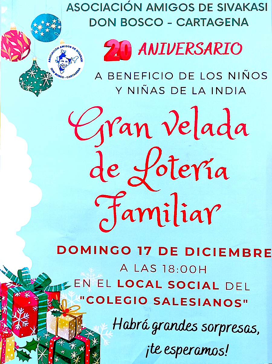 La asociación de amigos que recoge fondos para ayudar a los niños de dicho poblado de la India organiza con ese fin este próximo domingo, a las 18 horas, en el local social del Colegio Salesiano de Los Dolores-Barriada de Hispanoamérica, una lotería familiar con regalos y sorpresas.