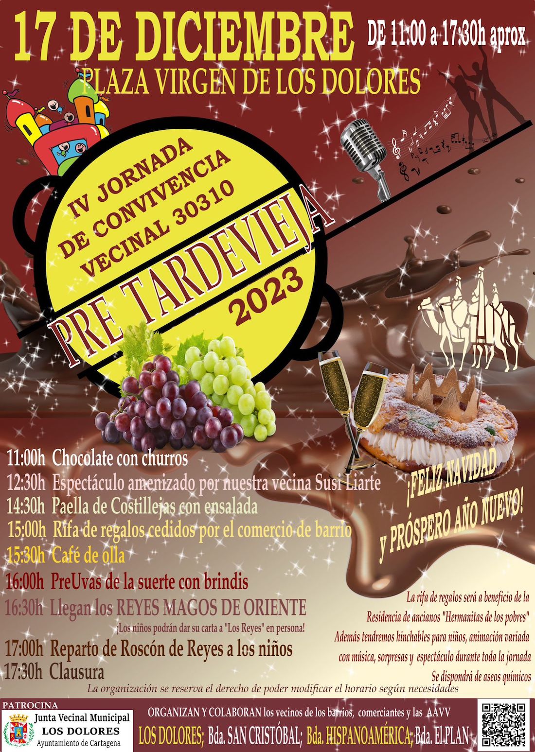 La Junta Vecinal Municipal, con la colaboración de asociaciones de vecinos y comercios de cuatro barriadas, organiza la cuarta edición de la jornada de convivencia en la plaza Virgen de los Dolores, que contará con chocolatada, espectáculo con Susi Liarte, macrorrifa de regalos (a beneficio de las 'Hermanitas de los pobres') y la presencia de los Reyes Magos, además de obsequio de arroz con costillejas, ensalada, café de puchero y preuvas de la suerte con brindis.