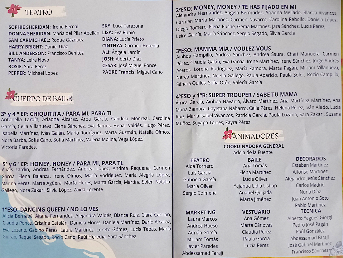 Decenas de jóvenes son los que llevaron a cabo la representación, con un grupo de 16 que llevó el pesó de la trama y numerosos alumnos desde tercero de Primaria hasta primero de Bachillerato que enriquecieron esa puesta en escena con los bailes, a los que se suman los animadores, siendo el equipo del Club Juvenil Áncora el que coordina a tanta joven alma con un trabajo previo que comienza varios meses antes.