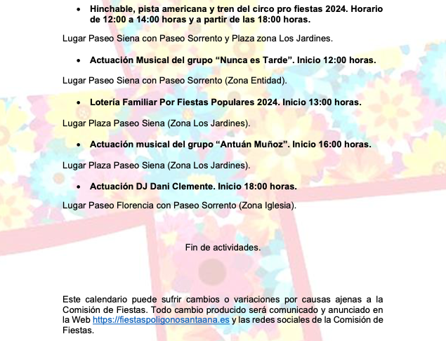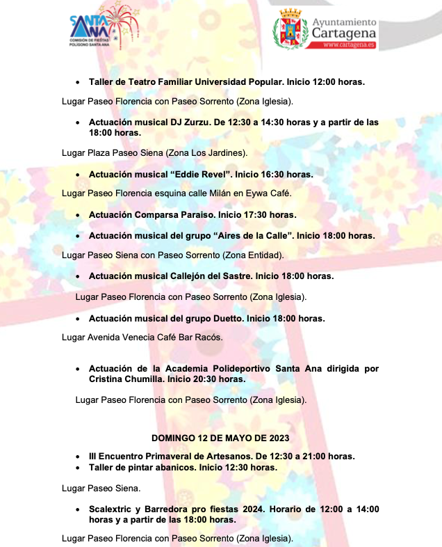 La edición de este año, que tendrá lugar del 10 al 12, abarca una jornada más que en 2023. La comisión de fiestas abrirá el programa con la cruz floreada en varias plazas, pues serán en diferentes enclaves de la barriada de Cartagena norte por donde actúen academias de danza, varios ‘djs’, la comparsa ‘Paraíso’ (foto adjunta), los grupos ‘Aires de la calle’, ‘Callejón del sastre’, ‘Nunca es tarde’, ‘Antuán Muñoz’ y ‘Duetto’, además de la tercera edición del encuentro primaveral de artesanos, entre otras propuestas.