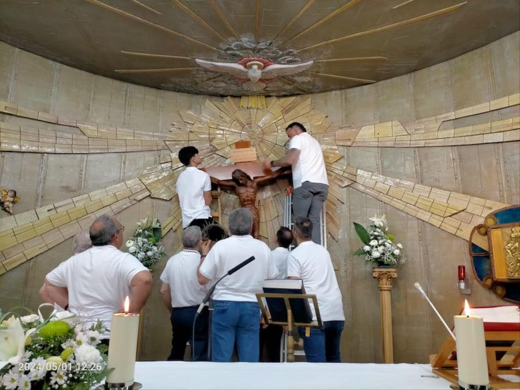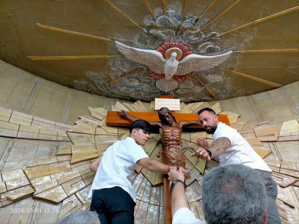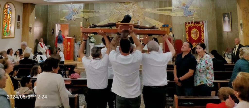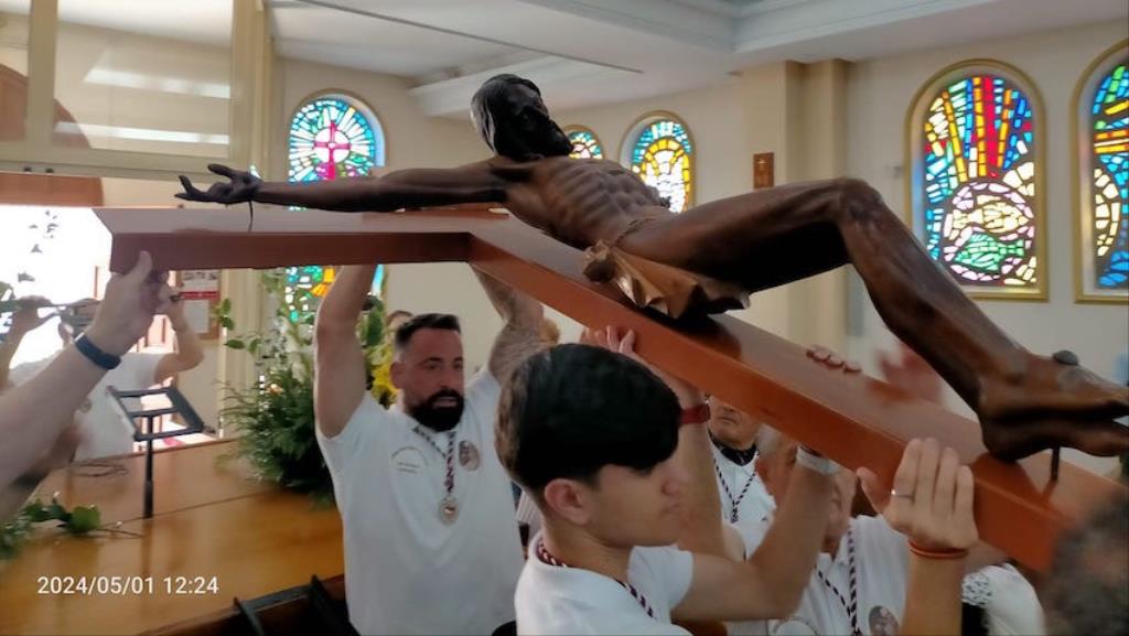 La imagen del crucificado de la parroquia de la calle Soledad, dentro de sus fiestas anuales, ha protagonizado la séptima procesión con música procesionista, una estela de fieles y mejoras en varios aspectos.