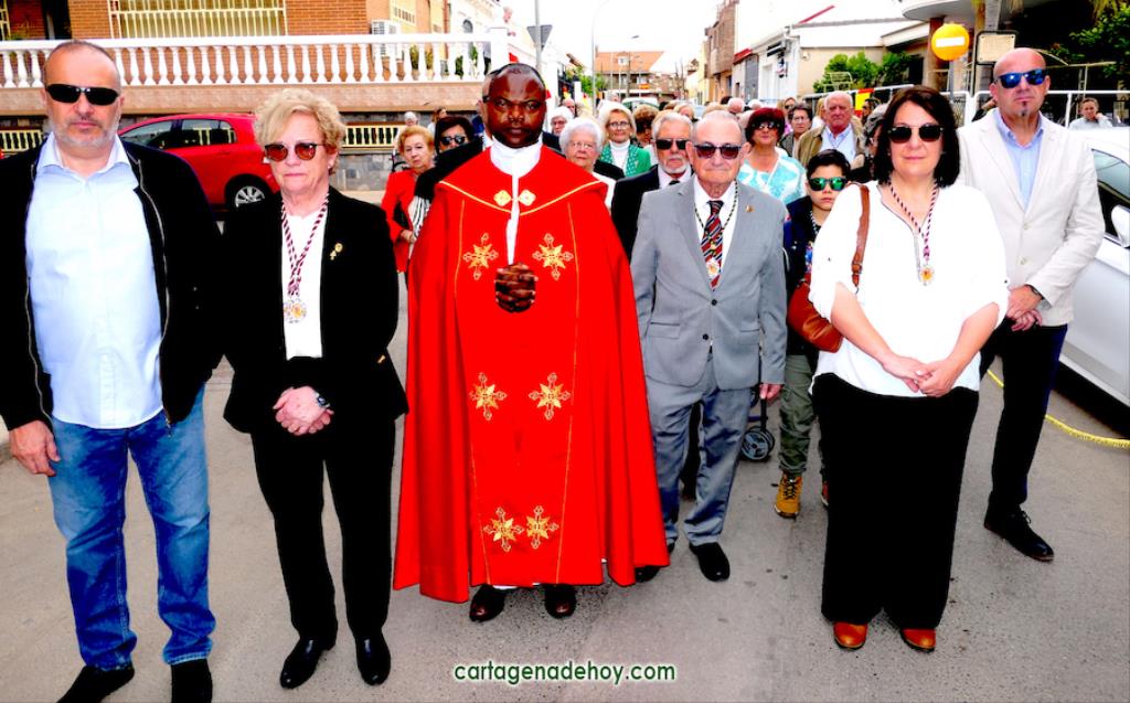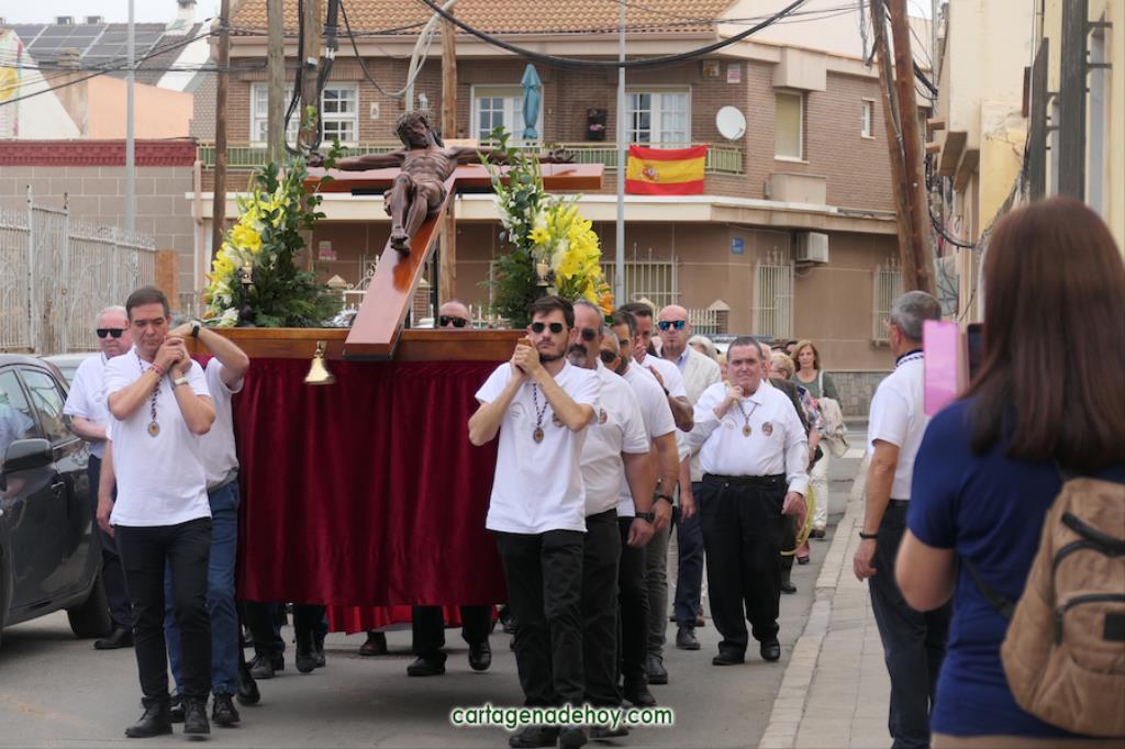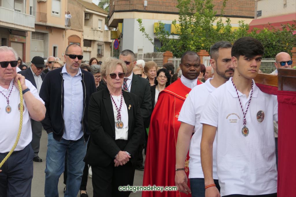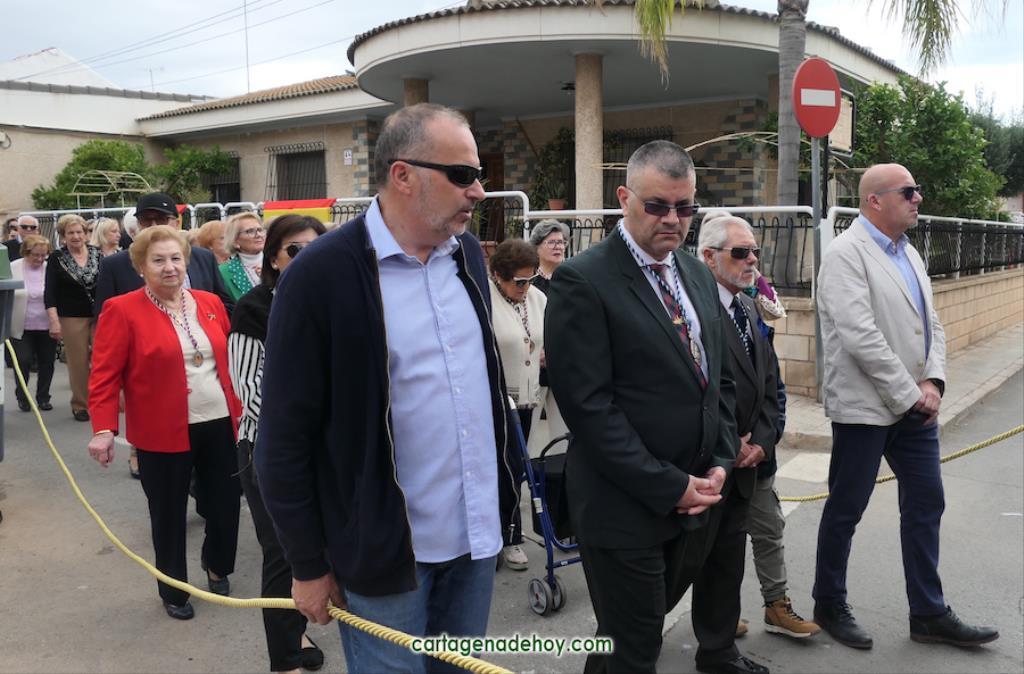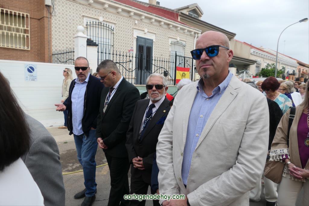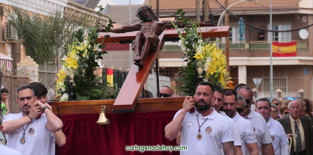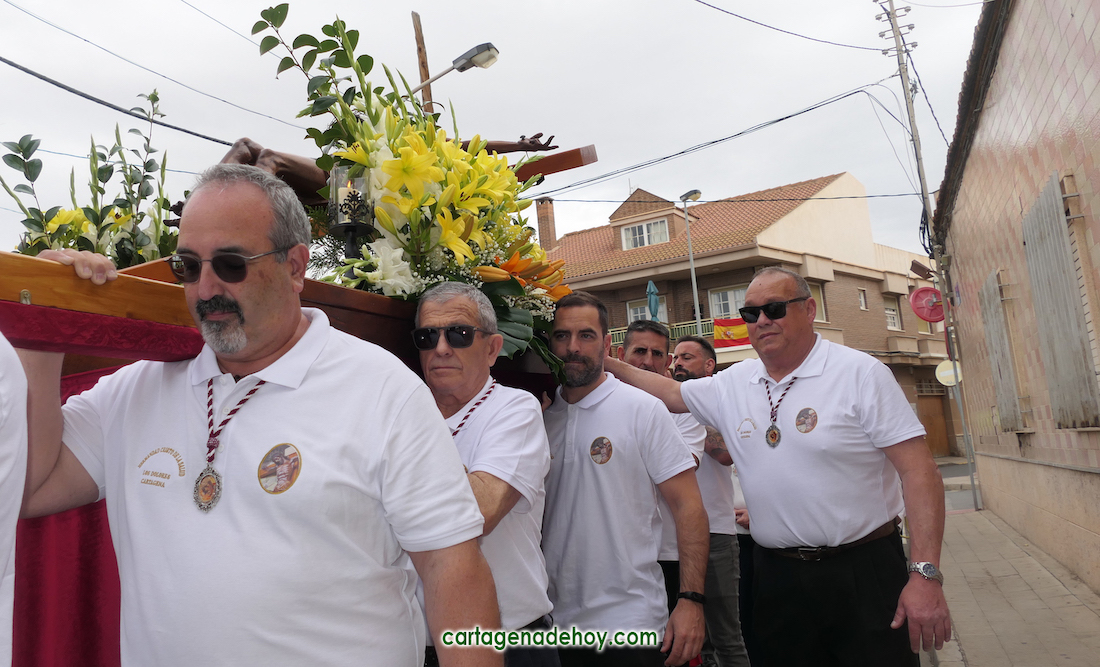 La peana sobre la que iba el crucificado ligeramente inclinado fue llevada por diez costaleros, nueve hombres y una mujer, quienes estrenaban polo con la imagen del Cristo y la leyenda ‘Hermandad del Cristo de la Salud. Los Dolores. Cartagena’, cuyo hermano mayor desde 2007, Ángel Valverde Caballero, marchaba a continuación junto al párroco, Ramón Mitogo, y la presidenta de la Junta Vecinal Municipal, Julia Otón (PP); el vicepresidente, Fulgencio Bernal (Vox) y los vocales Fulgencio Angosto y Antonio Valverde (MC), yendo este último como costalero.