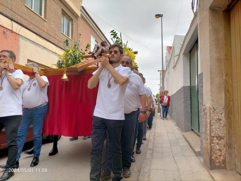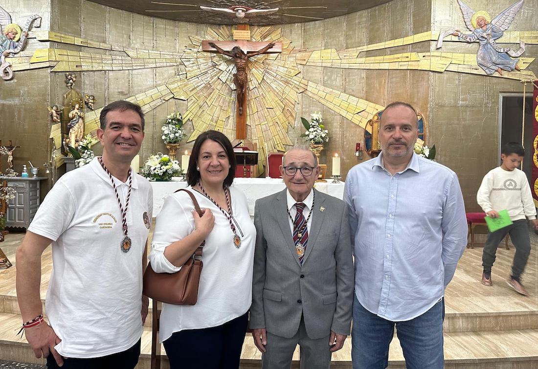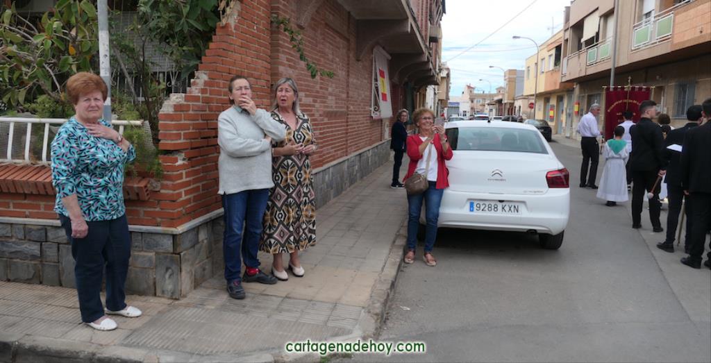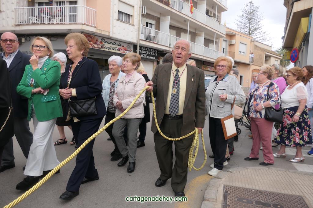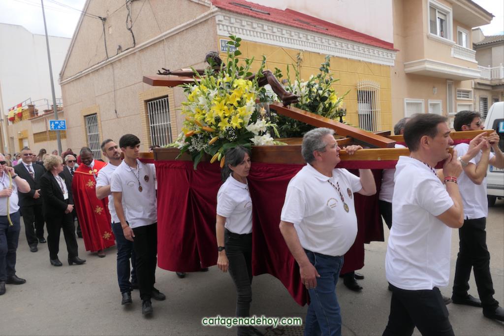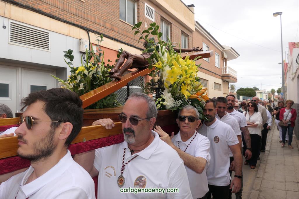 La peana sobre la que iba el crucificado ligeramente inclinado fue llevada por diez costaleros, nueve hombres y una mujer, quienes estrenaban polo con la imagen del Cristo y la leyenda ‘Hermandad del Cristo de la Salud. Los Dolores. Cartagena’, cuyo hermano mayor desde 2007, Ángel Valverde Caballero, marchaba a continuación junto al párroco, Ramón Mitogo, y la presidenta de la Junta Vecinal Municipal, Julia Otón (PP); el vicepresidente, Fulgencio Bernal (Vox) y los vocales Fulgencio Angosto y Antonio Valverde (MC), yendo este último como costalero.