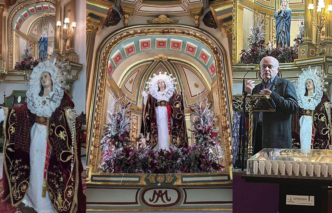 La imagen titular  de Nuestra Señora de los Dolores del barrio cartagenero del mismo nombre se encuentra en proceso de restauración, siendo la talla que sale en romería la que ocupa su lugar en el altar y la que hoy ha ‘contemplado’ la jornada de cariño que ha recibido la imagen de Jesús Medinaceli por parte de fieles y de alumnos del colegio del Sagrado Corazón.
