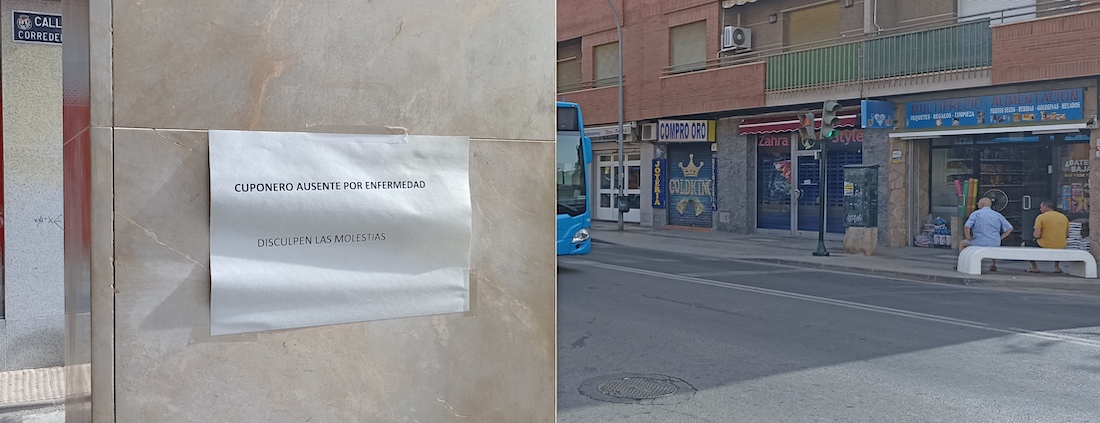 Un vecino nos remitió esta imagen de cómo un vendedor de cupones de la calle de Alfonso XIII de Los Dolores informa a su clientela que no podrá estar en su sitio habitual debido a que se encuentra enfermo.