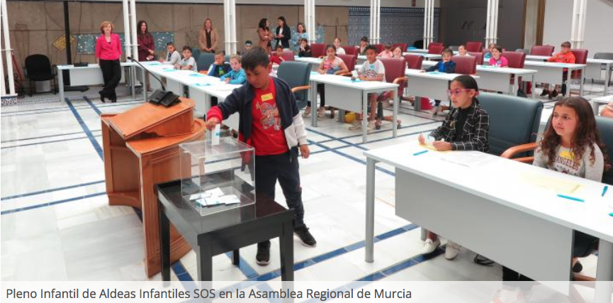Cuarenta y siete escolares de los colegios de educación primaria Aníbal de Los Mateos y Vicente Medina de Los Dolores se han convertido esta mañana en 'diputados' por un día durante el pleno infantil que se ha celebrado en la Asamblea Regional y que ha sido organizado por Aldeas Infantiles SOS, con el objetivo de fomentar el valor de la responsabilidad con la Agenda 2030 y de reflexionar en torno a la consecución de los Objetivos de Desarrollo Sostenible (ODS).