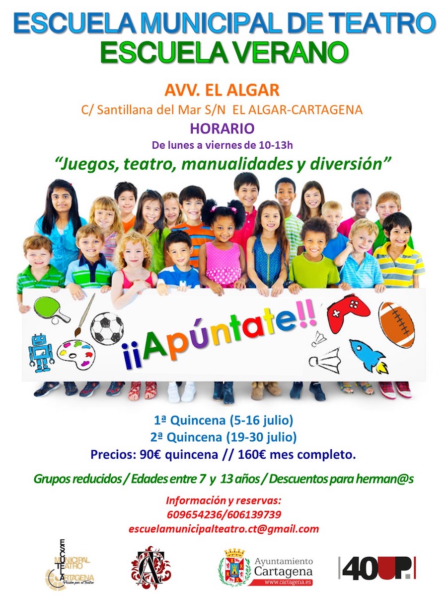 La Escuela Municipal de Teatro de Cartagena,  pone en marcha este año nuevamente su Escuela de Teatro de verano para niños y jóvenes entre 7 y 13 años de edad.