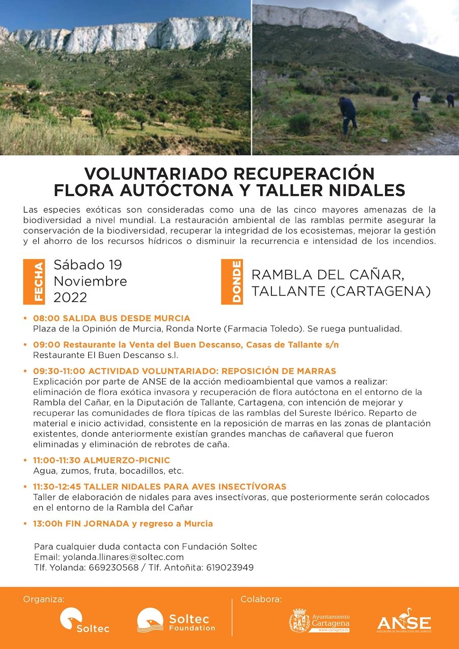 El Cartagena Jazz Festival, Soltec y Anse se unen un año más para realizar una acción de voluntariado medioambiental dentro del festival organizado por el Ayuntamiento de Cartagena. Esta edición se centrará en la recuperación de la flora autóctona y taller de nidos en la rambla del Cañar. Será en la mañana de este sábado 19 de noviembre. La acción está abierta.