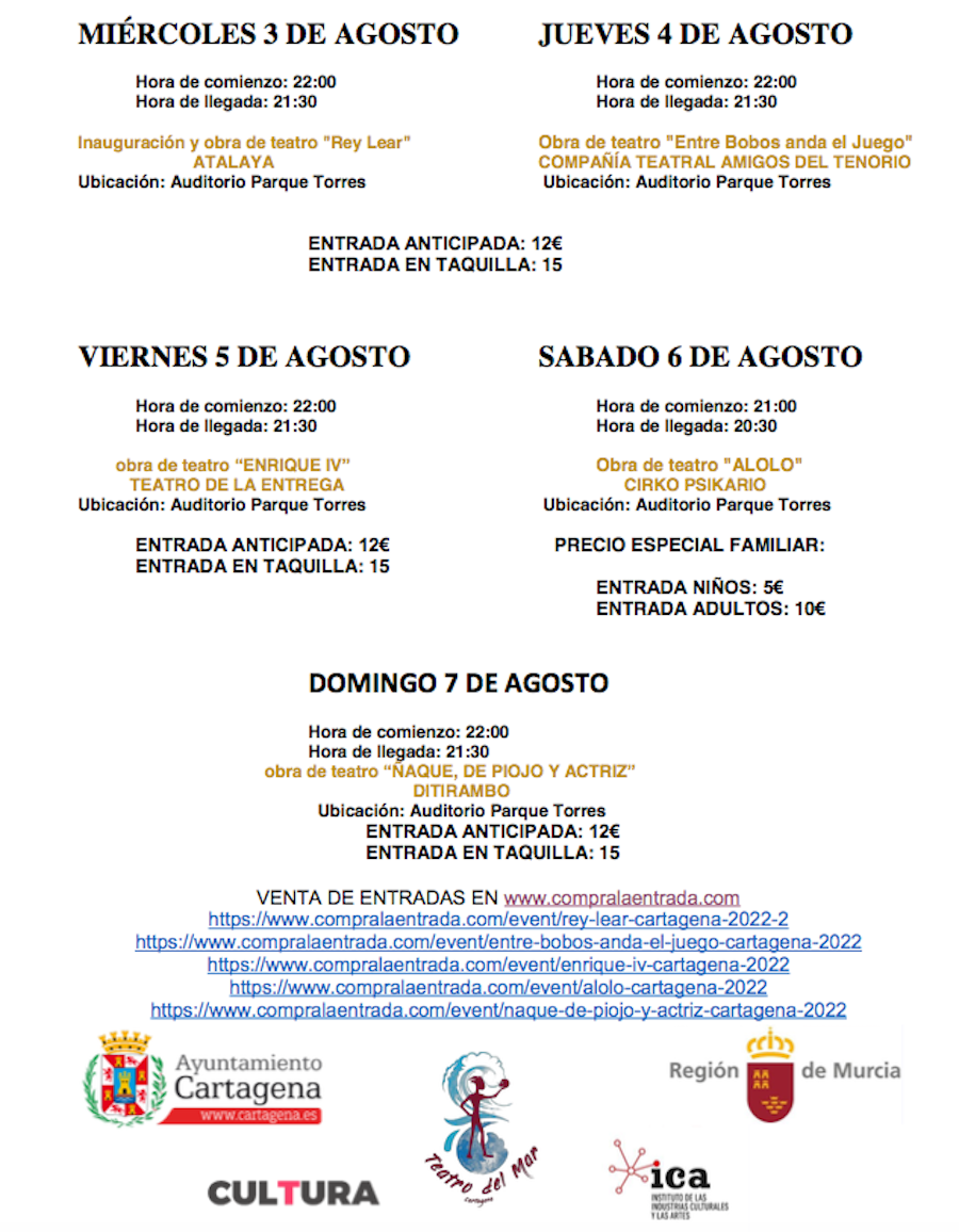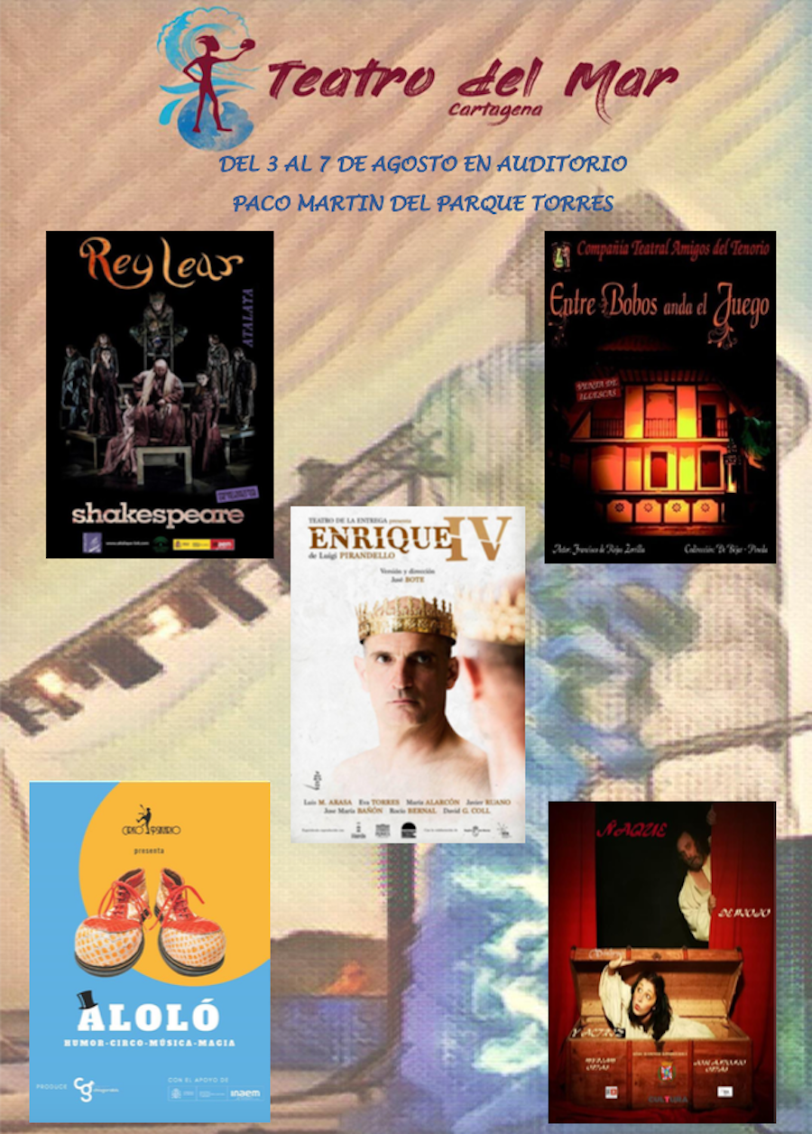 La segunda edición se desarrollará del 3 al 7 de agosto en el auditorio ‘Paco Martín’ del Parque de Torres con ‘Rey Lear’ (compañía Atalaya), ‘Entre bobos anda el juego’ (Amigos del Tenorio), ‘Enrique IV’ (Teatro de la entrega), ‘Aloló’ (Cirso Psikario) y ‘Ñaque, de piojo y actriz’ (Ditirambo de Cartagena). Las entradas cuestan 15 euros en taquilla y 12 de forma anticipada, con excepción de ‘Aloló’ que cuestan 5 euros para niños y 10 para adultos.